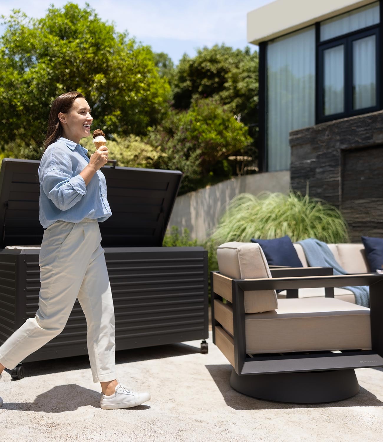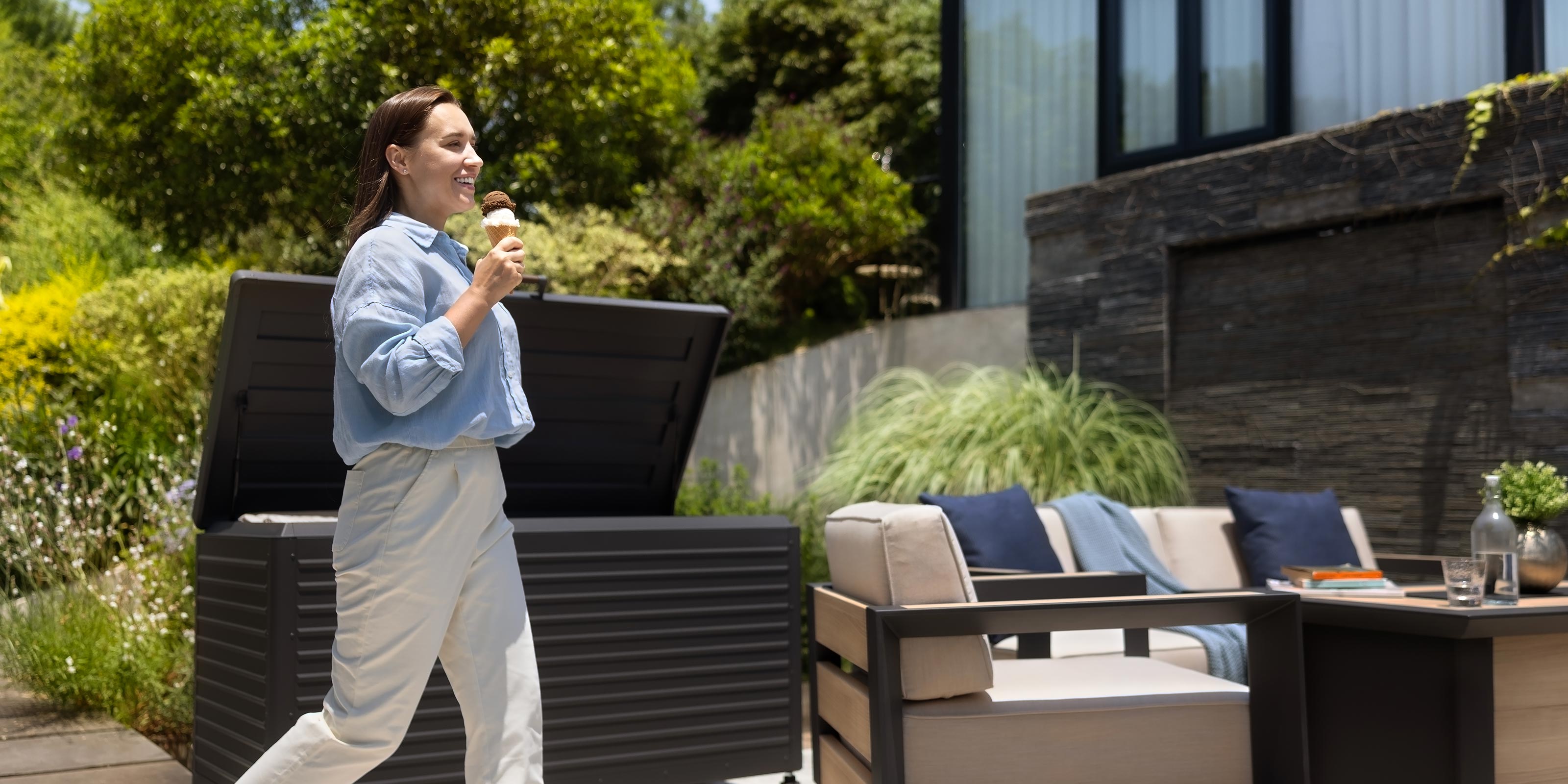 The Deck Box, equipped with wheels and a soft-close lid. Experience the convenience of effortless mobility and the gentle closing lid function. Constructed from rust-proof aluminum and galvanized steel, this storage unit promises timeless elegance and reliable functionality through all seasons. This modern storage solution is perfect for your contemporary outdoor area, ensuring a tidy and well-organized garden, patio, or pool space. Its ample capacity allows for the storage of large cushions, pool necessities, gardening tools, and children's toys, making it a versatile addition to your outdoor living space.
