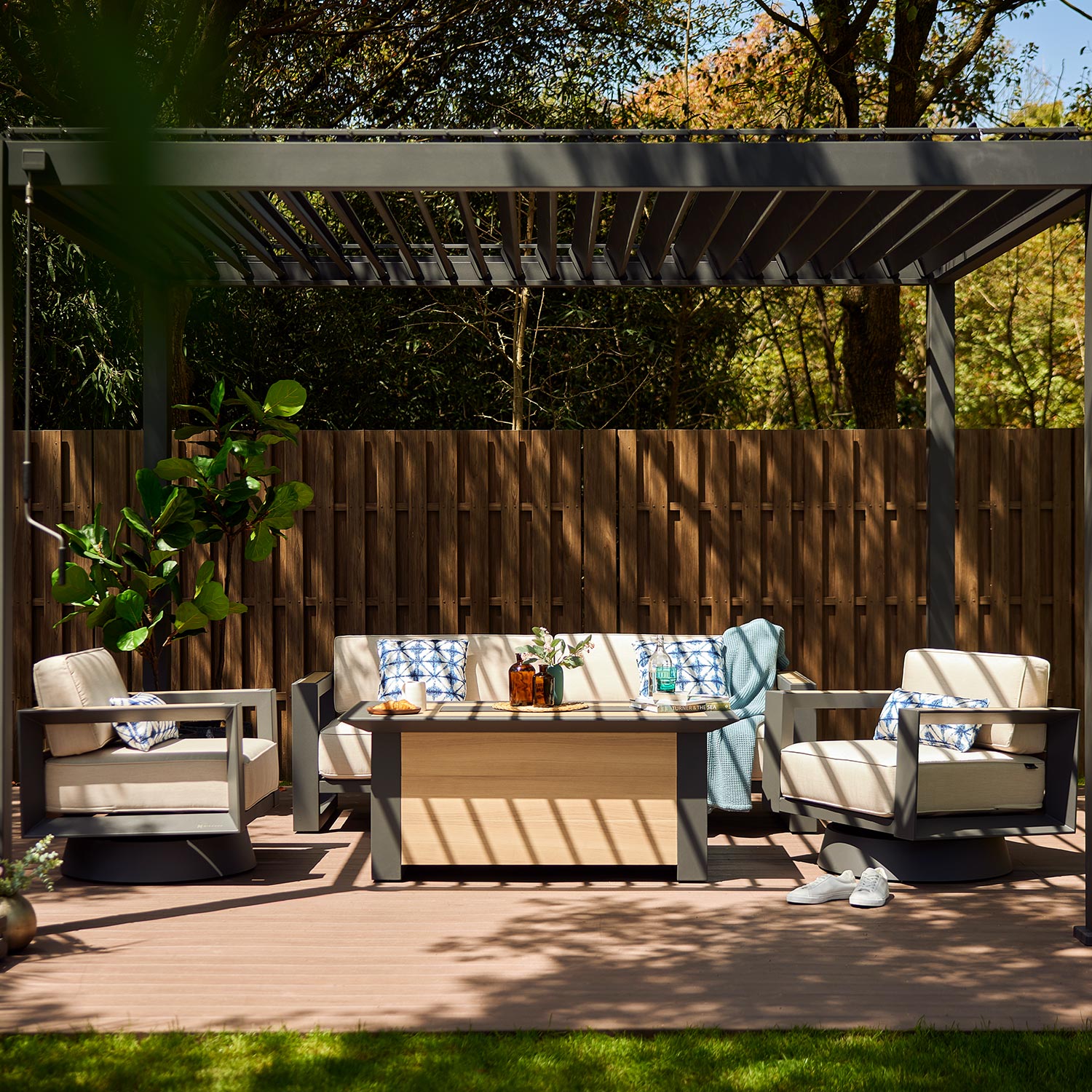 Enjoy a mordern outdoor living space with an aluminium pergola with a louvered roof. The louvered roof can be adjusted to control sunlight and ventilation, ensuring optimal comfort. An aluminium pergola with a louvered roof provides the perfect setting. Experience the blend of modern design and practicality, and redefine your outdoor space with this versatile structure.