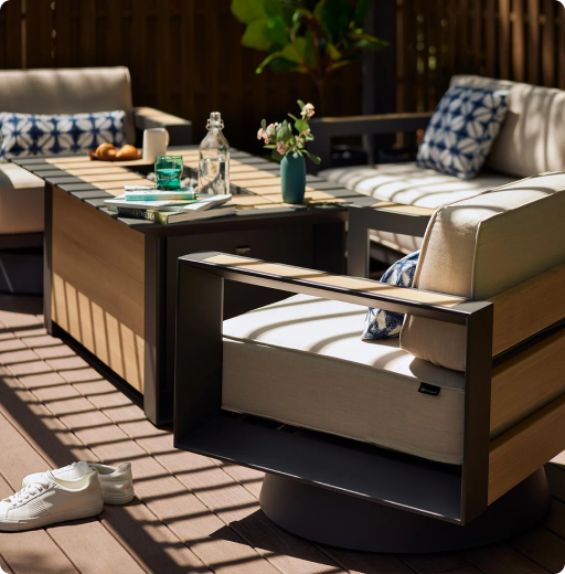 Entspannen Sie sich in den komfortablen Captain-Drehsesseln, ergänzt durch eine gemütliche Feuerstelle, die Ihrem Außenbereich einen Hauch von Romantik verleiht. Entdecken Sie mehr