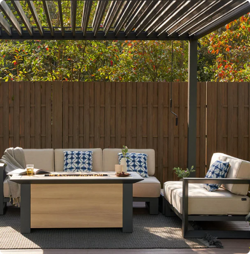 Erleben Sie die 111s Emotion Pergola: Verstellbare Lamellen sorgen tagsüber für Belüftung oder Schatten, während RGB-LED-Leuchten nachts eine gemütliche Outdoor-Atmosphäre schaffen.