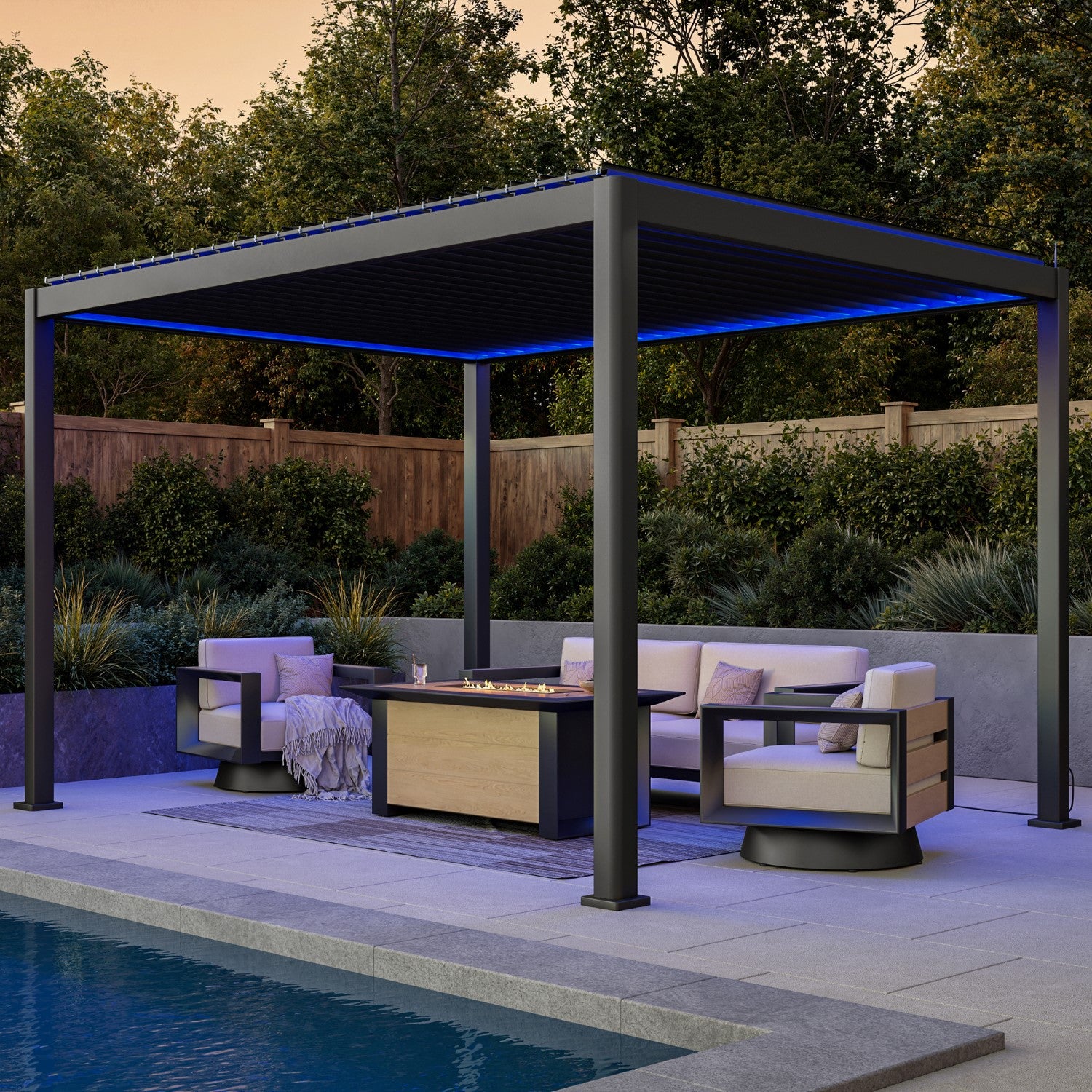 Erleben Sie die 111s Emotion Pergola: Verstellbare Lamellen sorgen tagsüber für Belüftung oder Schatten, während RGB-LED-Leuchten nachts eine gemütliche Outdoor-Atmosphäre schaffen.