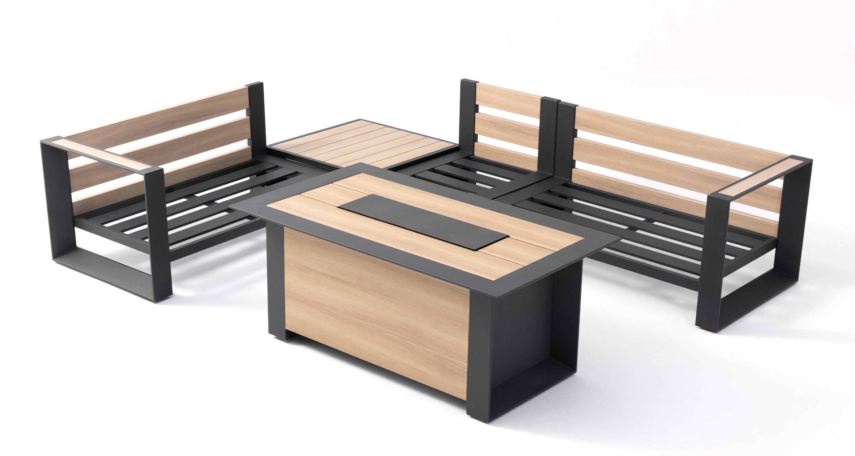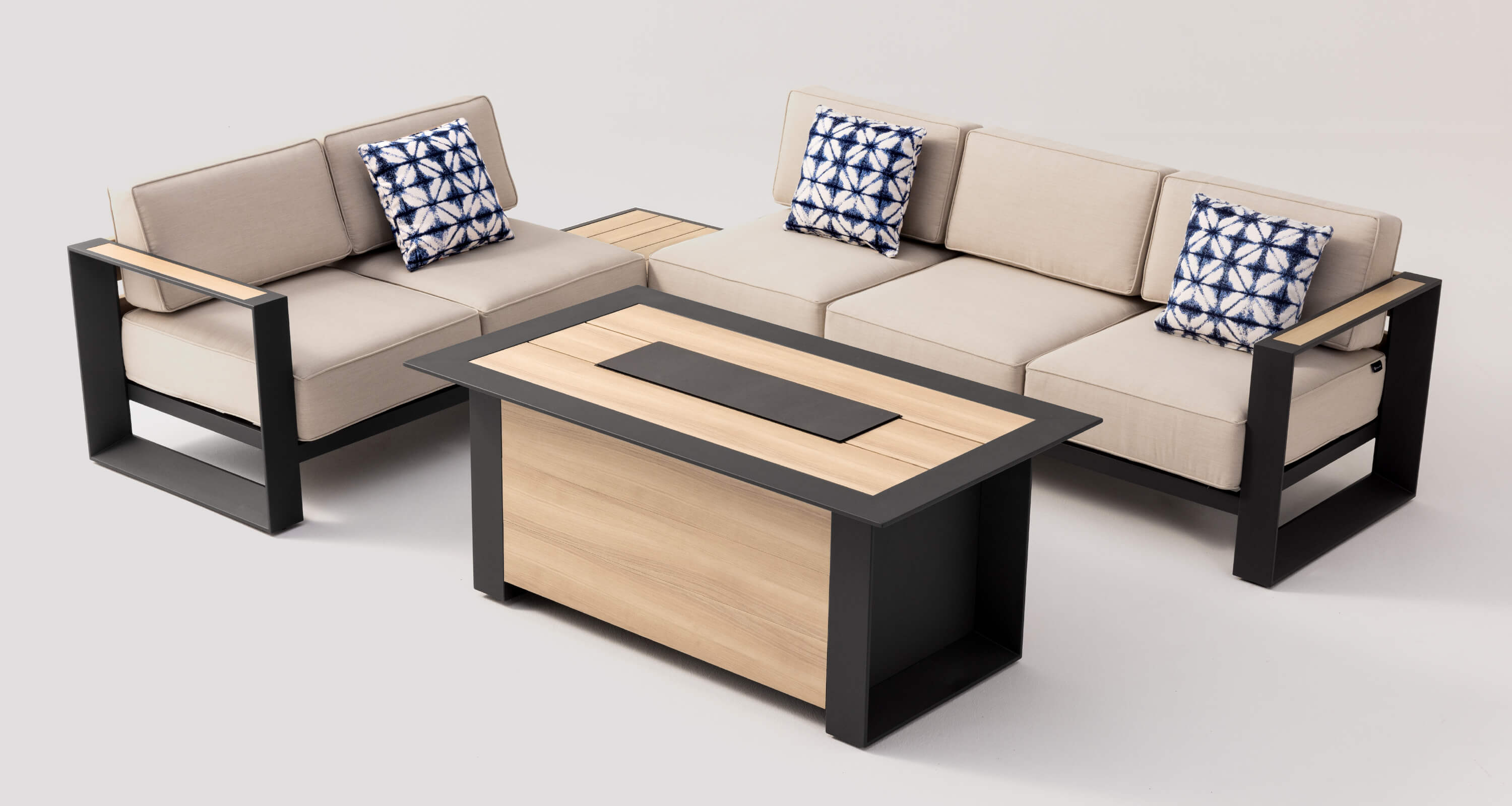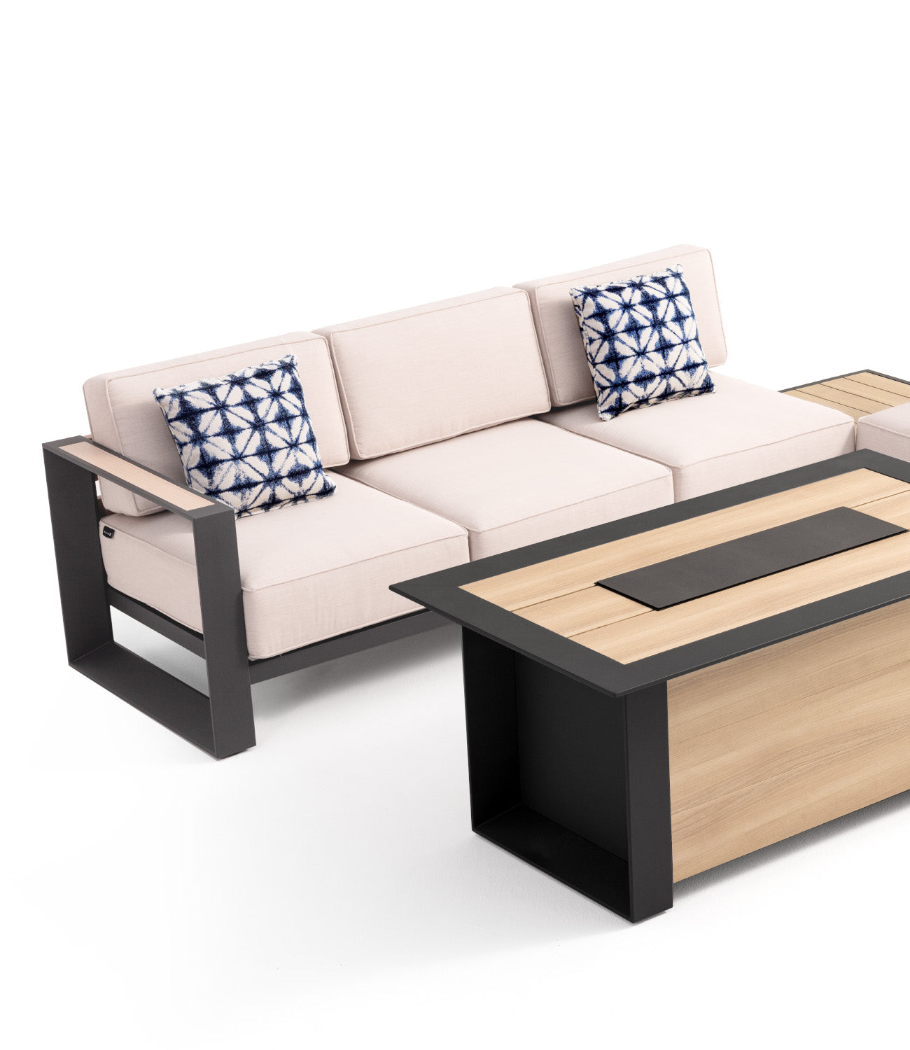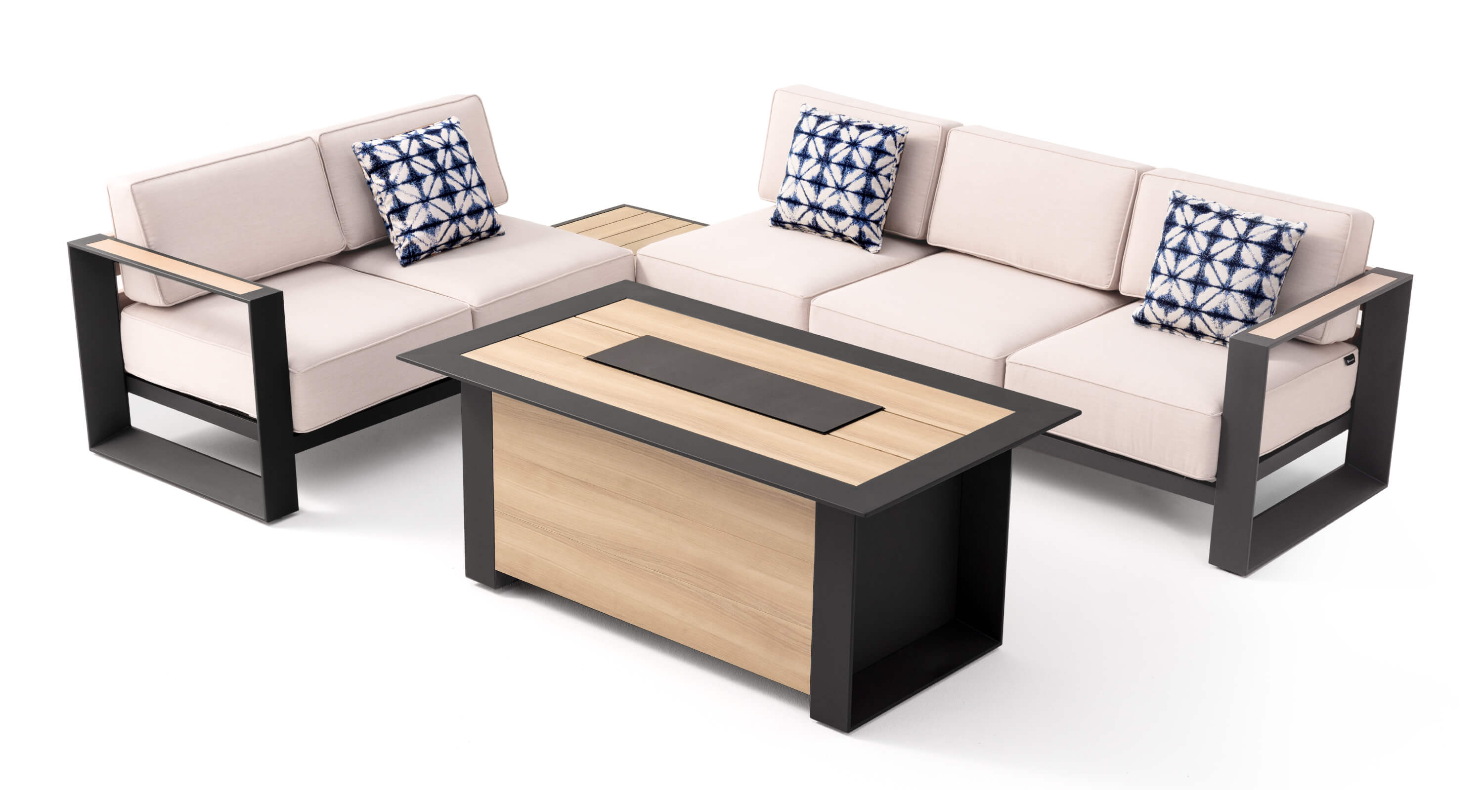 Unser 5-teiliges Sofa-Set verwandelt Ihren Außenbereich in eine gemütliche Wohnoase. Ein zentraler Feuertisch lädt zum Verweilen im warmen Schein der Flammen ein. Dank des modularen Aufbaus können Sie Ihre Sitzgruppe individuell gestalten. Ein Beistelltisch und drei Design-Zierkissen runden den luxuriösen Look ab. Dank korrosionsbeständigem Aluminium und den kuscheligen Sunbrella-Kissen werden Sie viele Jahre lang unvergessliche Momente mit Familie und Freunden erleben.