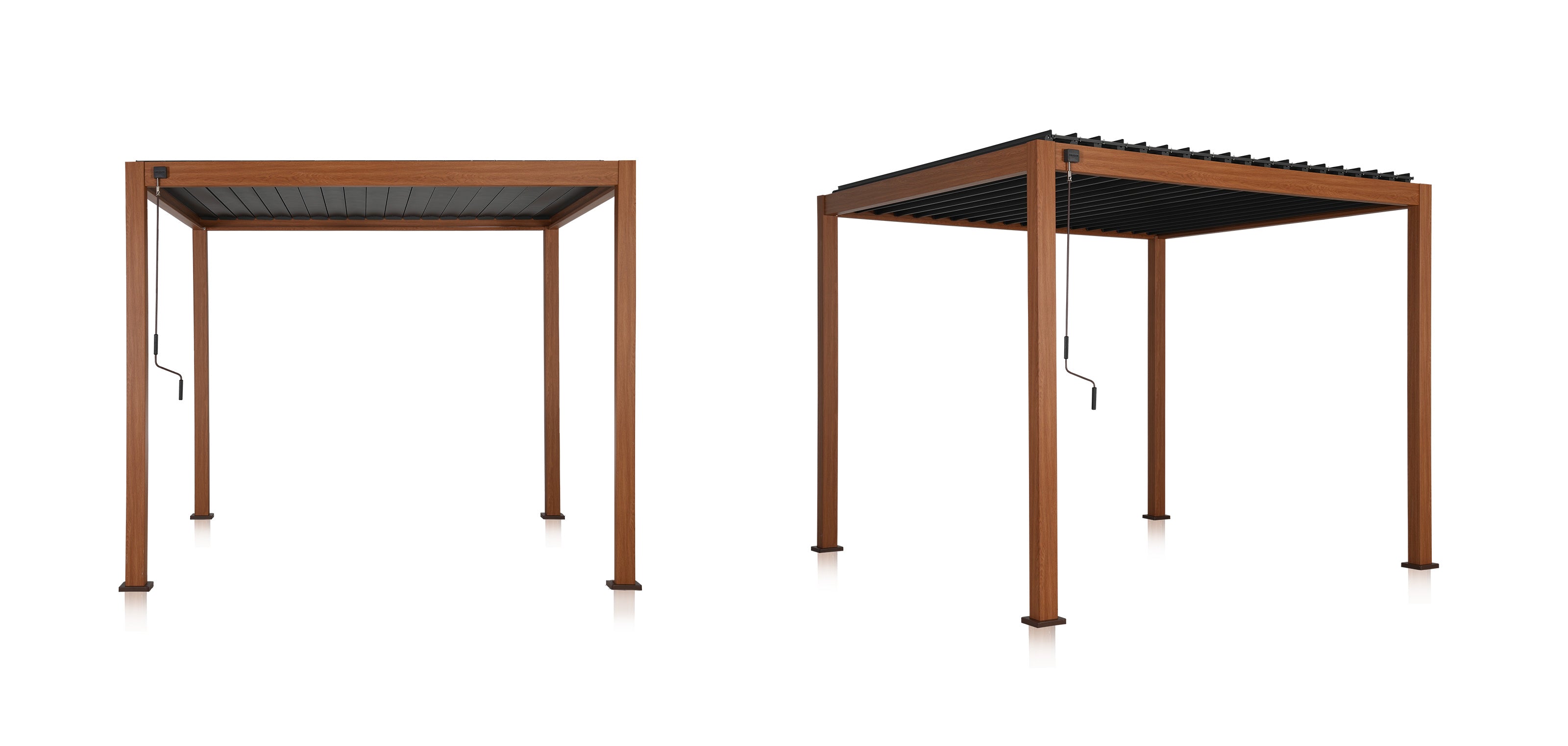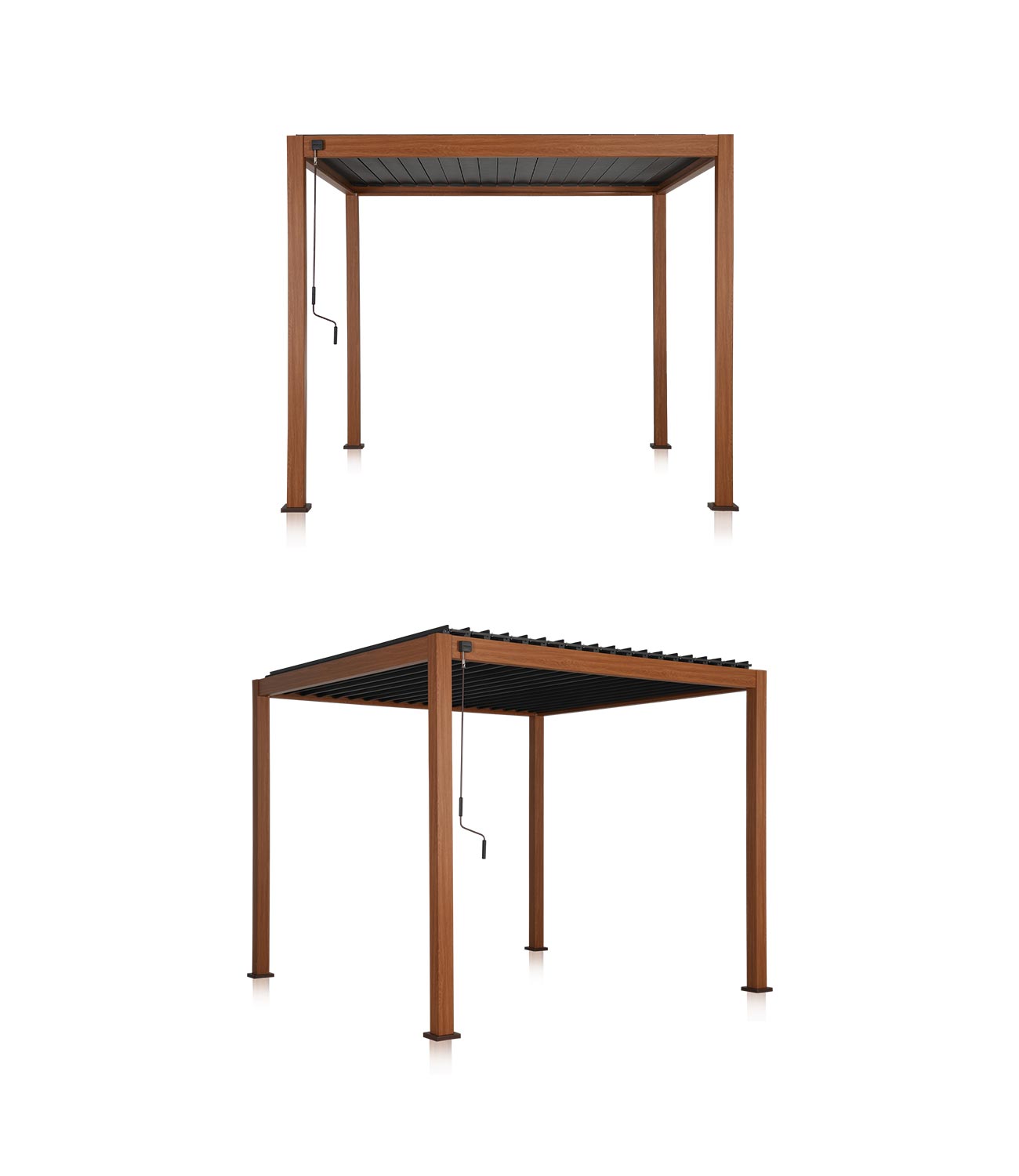 This pergola with our textured Takasho wood grain finish gives you the look and feel of real wood with none of the worry. Unlike natural timber, it won’t rot or easily discolor. A convenient hand crank gives you instant control over the elements, opening the galvanized steel louvers up to a full 93º. Simply turn the crank to open galvanized steel louvers to a full 93º. And when it rains, you’ll stay clean and dry, thanks to our patented Integrated Drainage System. Assembly is effortless — no rivets, no welds, or specialty tools need. Fix it to the ground with the supplied expansion bolts, and you have a sturdy, stable structure that can withstand 73mph winds.