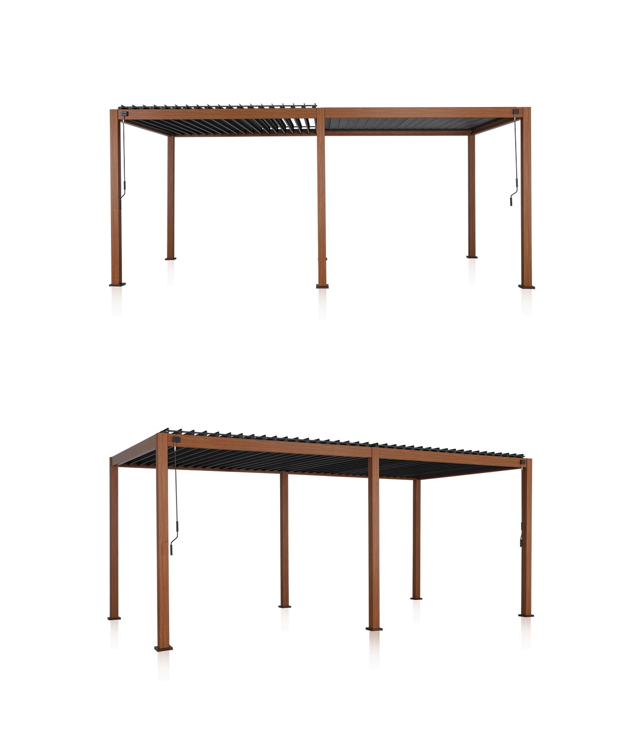 Kick back and unwind in the sun or the shade with this elegant but durable pergola. A convenient crank opens galvanized steel louvers as wide as 90º, giving you effortless control over the elements. Even if it rains, you can rest easy. Our patented Integrated Drainage System channels water away, keeping the area underneath clean and dry. Assembly is quick and easy too. All components are prefabricated — no rivets, no welds, no specialty tools. Fix it to the ground with the supplied expansion bolts, and you have a sturdy, stable structure that can withstand winds of 73mph.