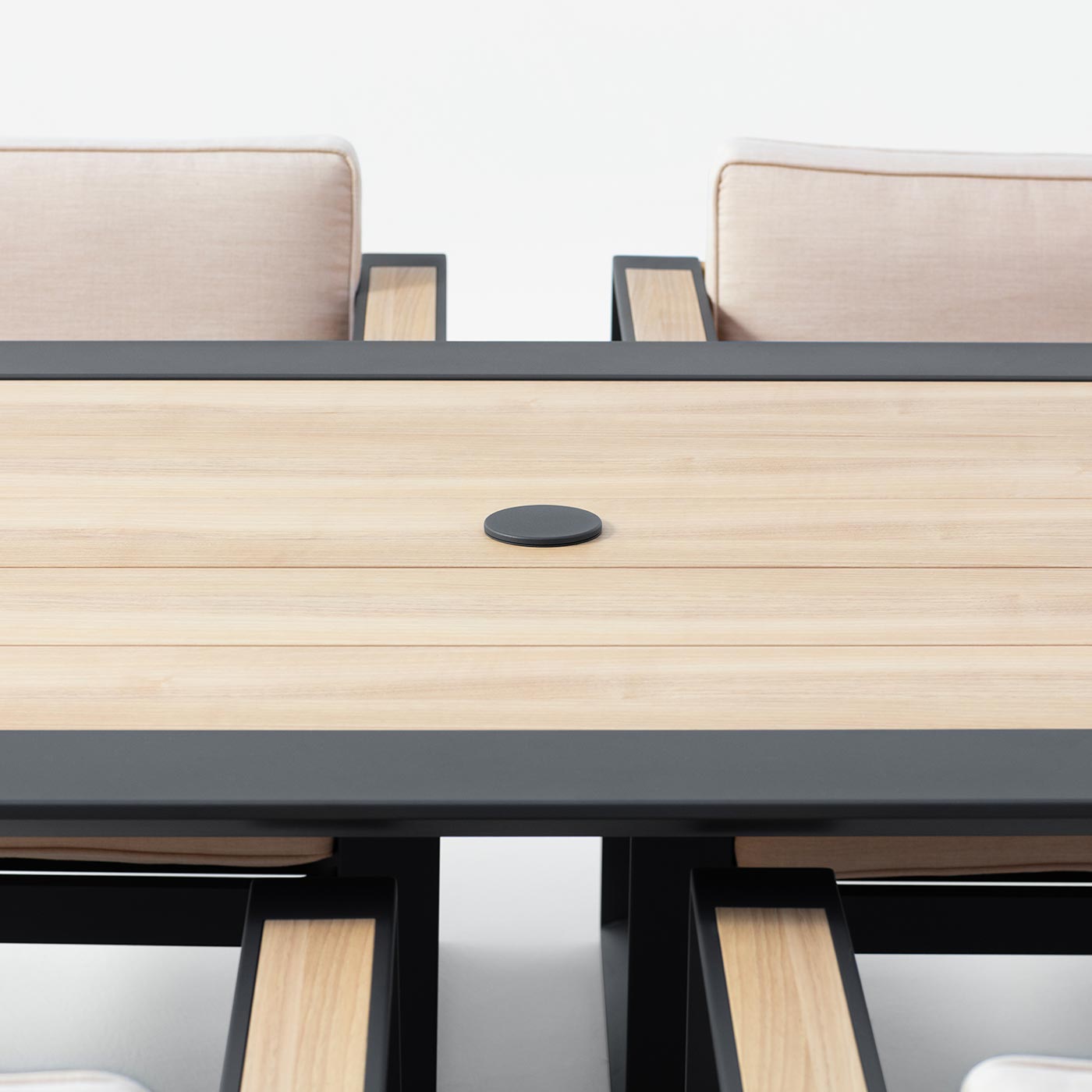 The dining table features an umbrella hole designed to accommodate various pole diameters, ensuring compatibility with a wide range of market umbrellas available on the market.