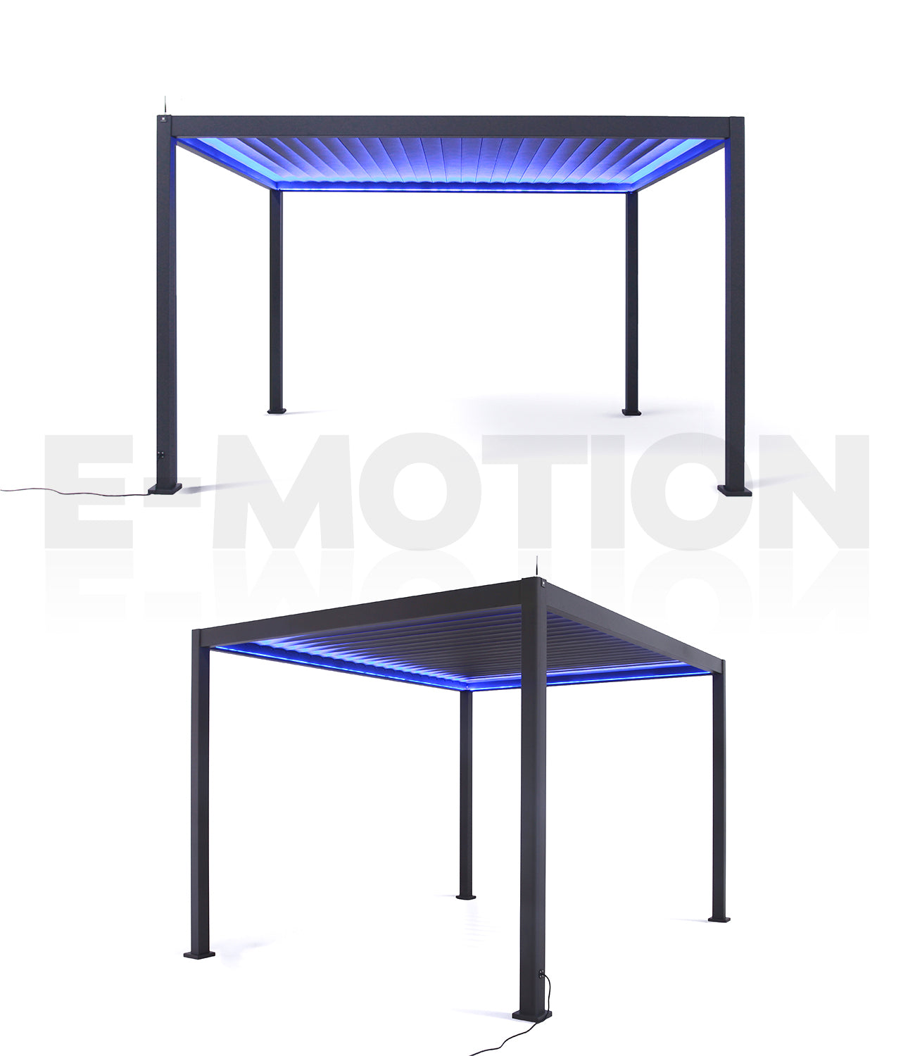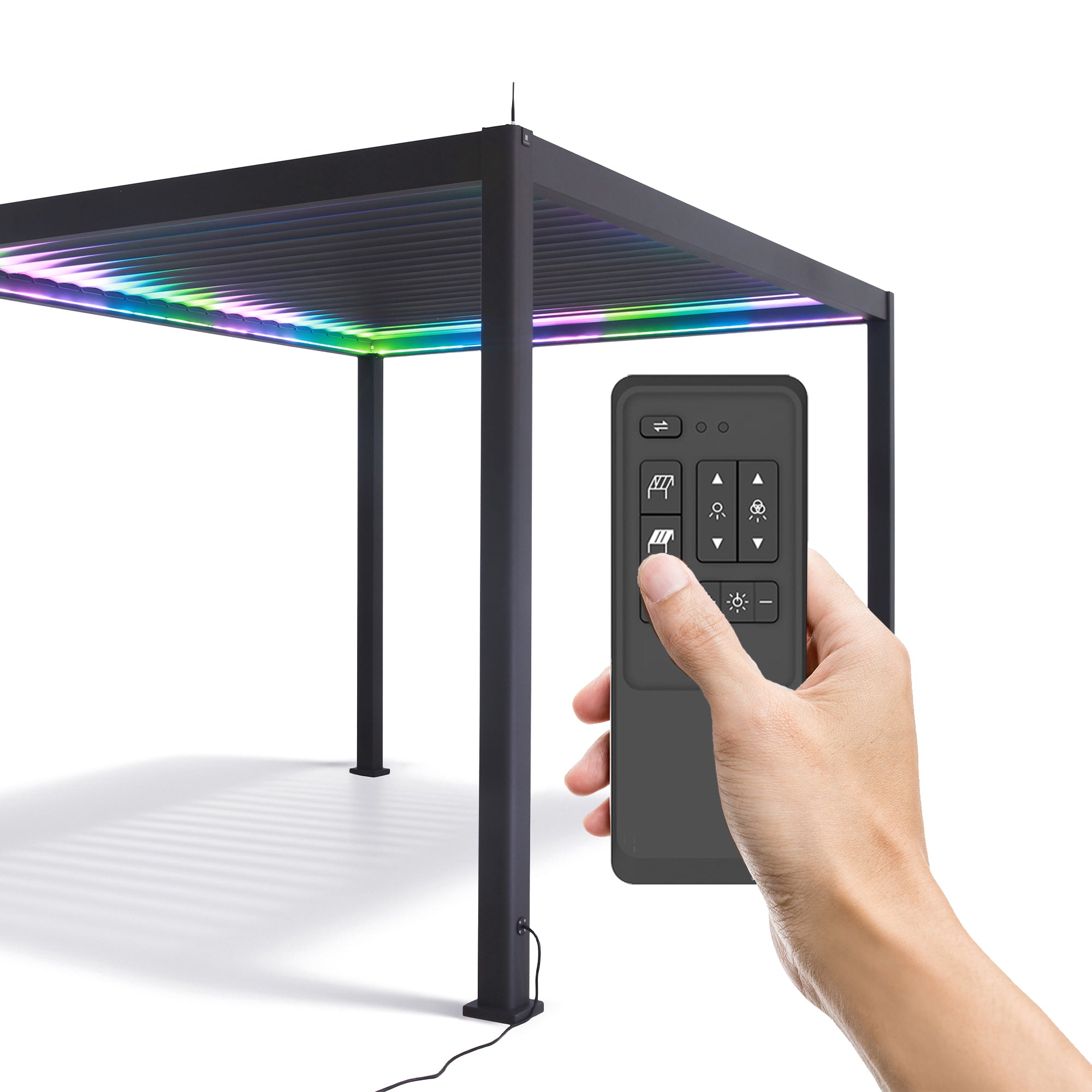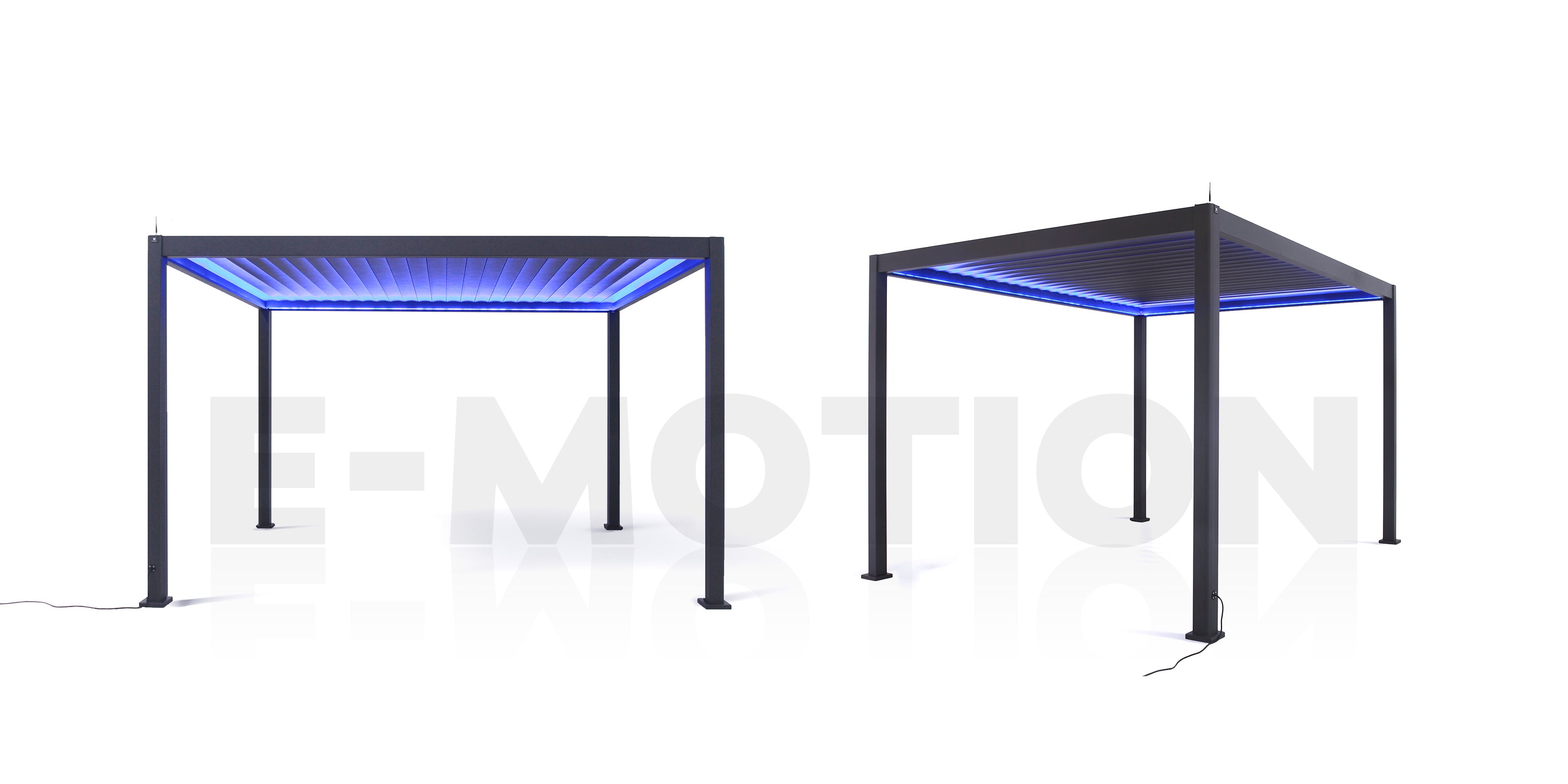 Introducing the 111sr E-Motion Pergola, a fully powered day and night pergola designed for comfort and convenience. This pergola features remote-controlled operation for both the louvers and LED lighting. The louvers open to a 93-degree angle, ensuring optimal ventilation and shade control. With a waterproof roof and integrated guttering system along the pergola's legs, you and your belongings stay protected and dry in any weather. The integrated RGB lighting allows you to customize the color and brightness to match your mood and ambiance preferences. Easy to self-assemble and maintenance-free, this pergola is crafted for hassle-free enjoyment. Its versatile size is ideal for creating your own outdoor living or dining area, providing a stylish and functional space for relaxation and entertainment day and night.
