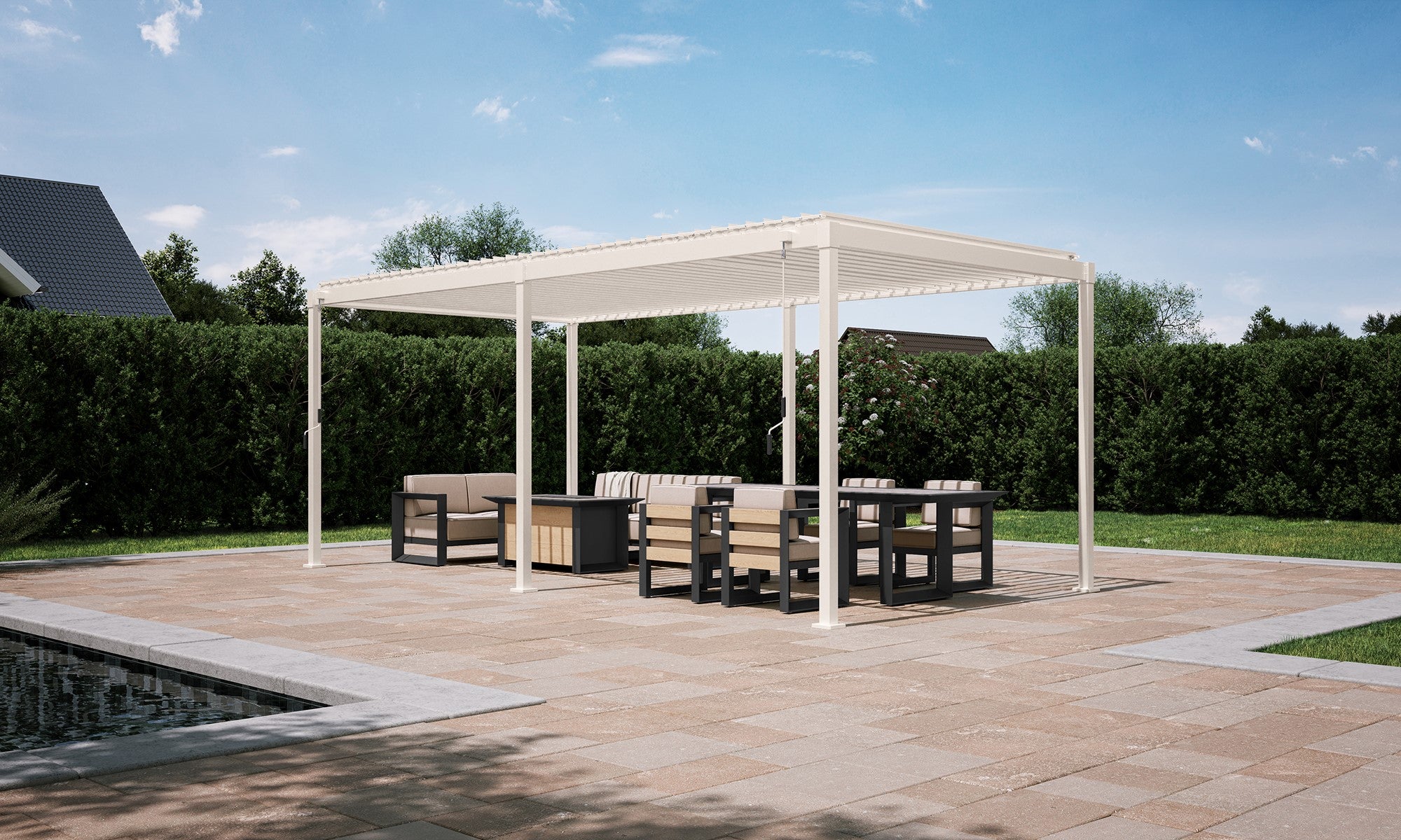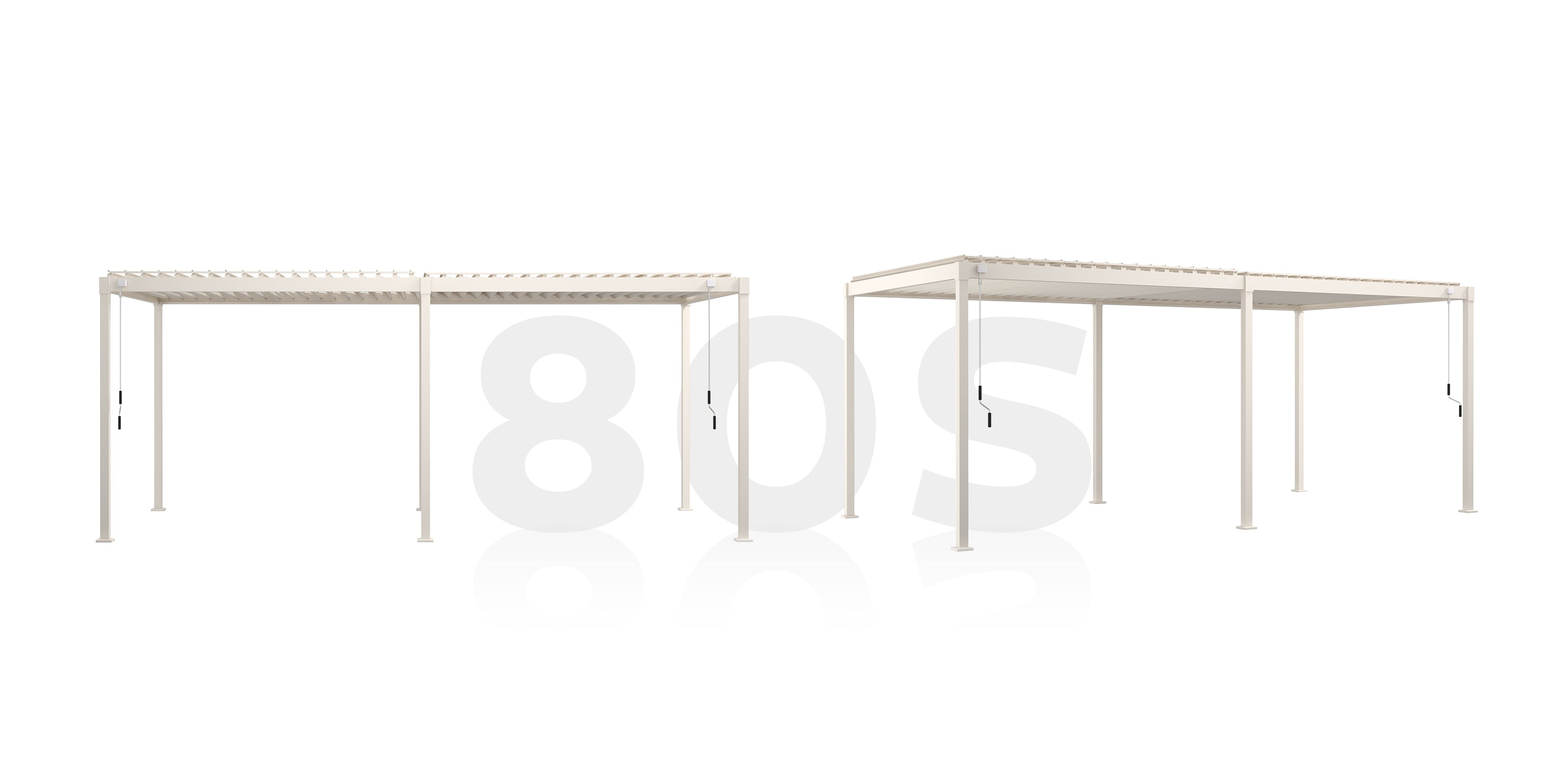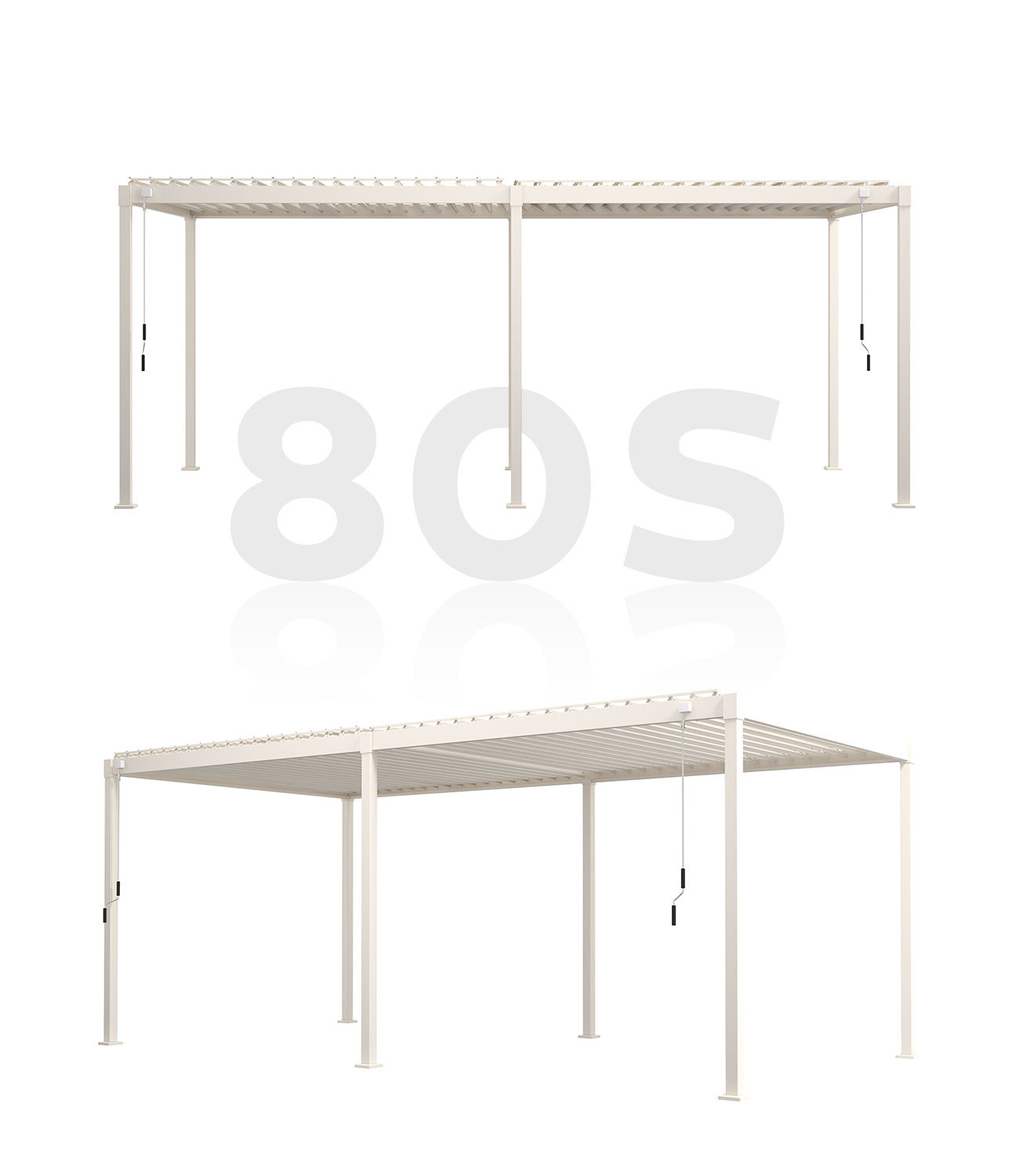 Bring modern style to any backyard, poolside or patio with our 80S bioclimatic pergola. Its intimate 10x10 footprint makes it ideal for hosting intimate gatherings of four to six guests. Designed for versatility, its louvered roof opens and closes easily via a user-friendly sling system. In seconds you can transition from full sun to partial shade. On warm days you can increase airflow. At night, you can gaze at the stars. Interlocking louvers create a weather-tight seal, keeping you dry in light rain while water is channeled away from the pergola. Made from high-grade galvanized steel, it is built to withstand the elements, bringing you years of enjoyment. Setup is hassle-free too — no special tools are needed for assembly, so you’ll be enjoying more in no time.