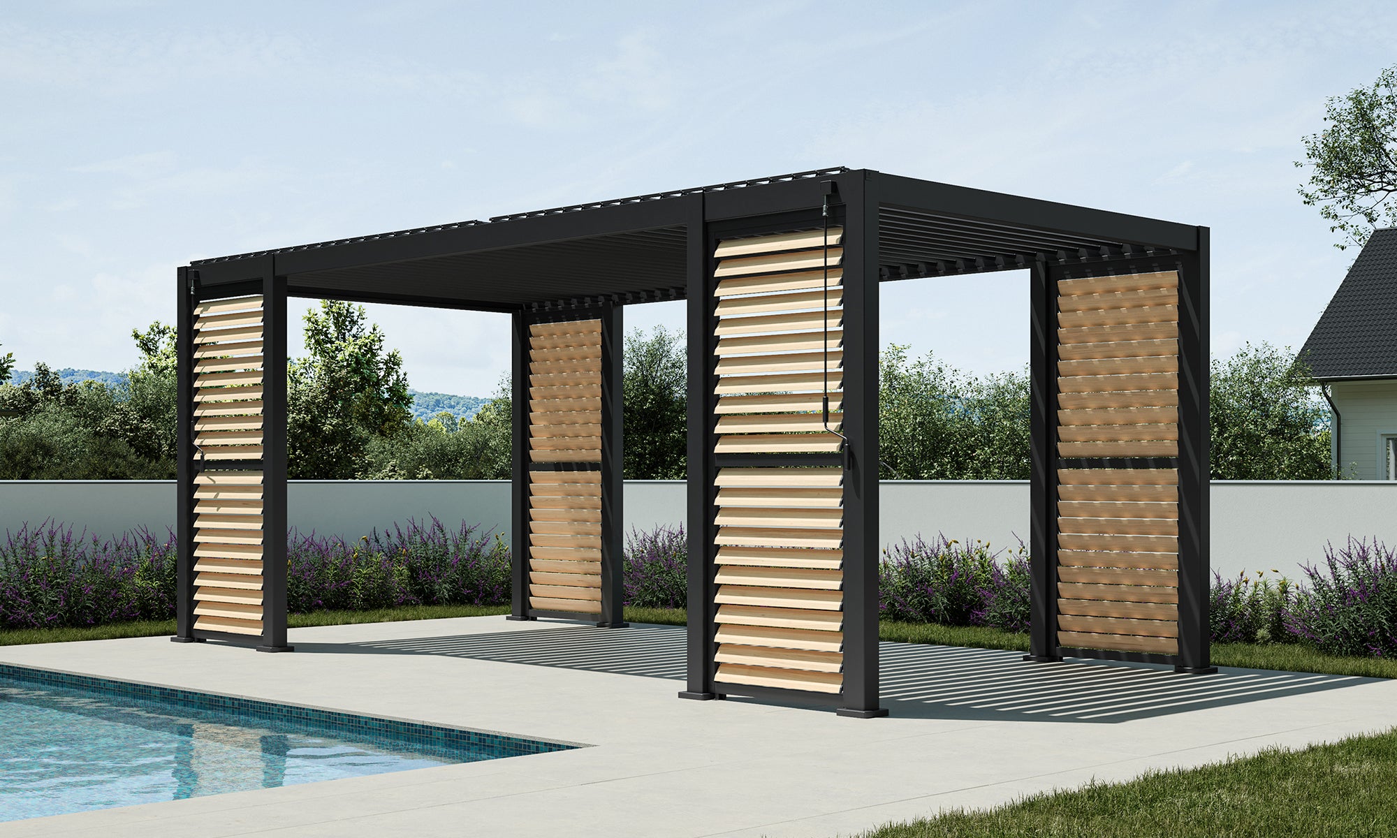 Whether you want an open breeze or soothing shade, this is the perfect pergola for you. Fitted with four full-height shutter walls, you can customize it for shelter from the elements or add a bit of extra privacy. Like our other pergolas, it features robust galvanized steel louvers that are easily adjusted up to 93° with a smooth-turn crank. And if it rains, have no fear—our patented Integrated Drainage System whisks water away, so everything underneath stays dry and clean. Installation is a cinch, too, with fully prefabricated components—no welding or rivets in sight, just easy assembly with the tools you already have. Secure it confidently with the included expansion bolts for a structure tough enough to handle winds up to 73 mph.