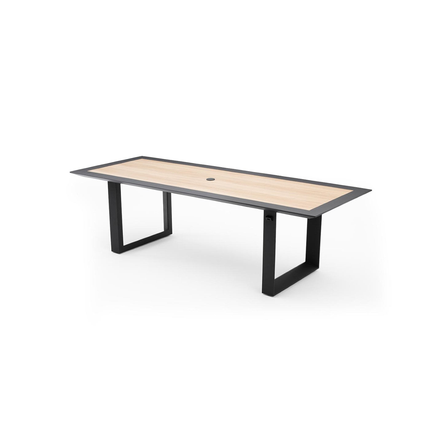 The dining table features an umbrella hole designed to accommodate various pole diameters, ensuring compatibility with a wide range of market umbrellas available on the market.