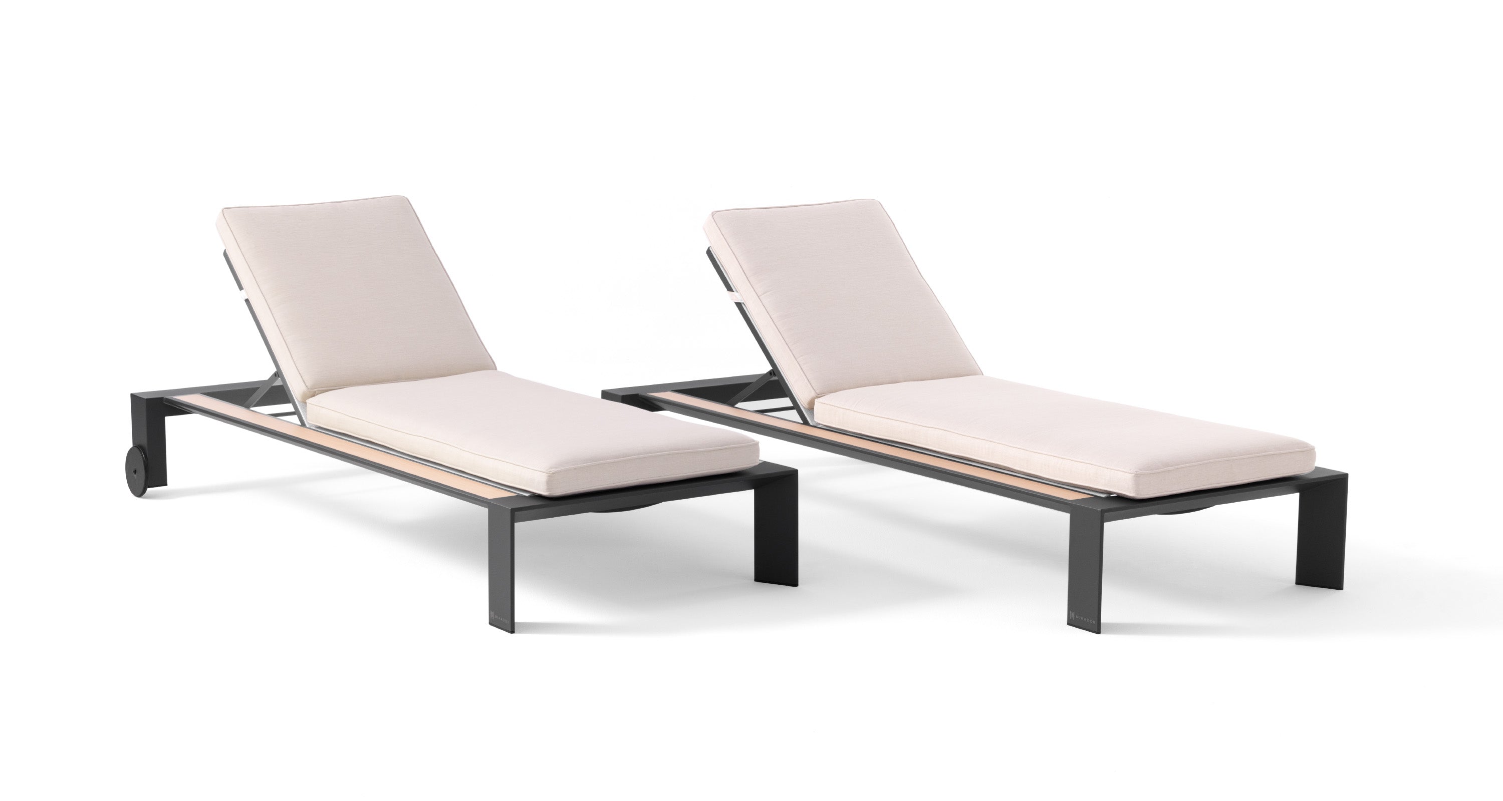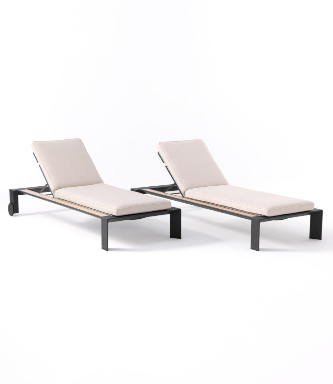 With our Catalina series chaise lounge set, you can stretch out, unwind, and soak up the sun. These reclining chairs bring contemporary design and pure comfort to your poolside, garden, or patio. Wide armrests double as handy side tables for drinks and snacks. Aluminum frames with simulated wood accents are corrosion-resistant. Cushions upholstered with waterproof Sunbrella fabric guard against stains, mold and mildew, ensuring years of enjoyment. Because the chairs are fitted with wheels, you can easily reposition them to catch rays or find shade. Also, the frames stack easily for easy, compact storage.