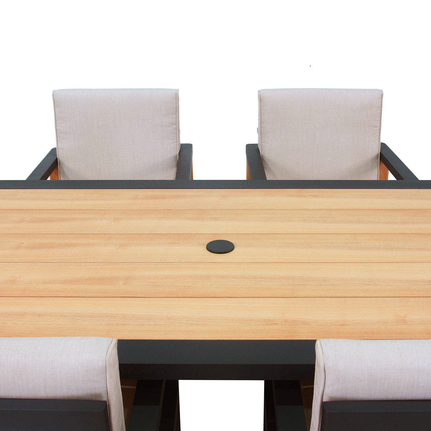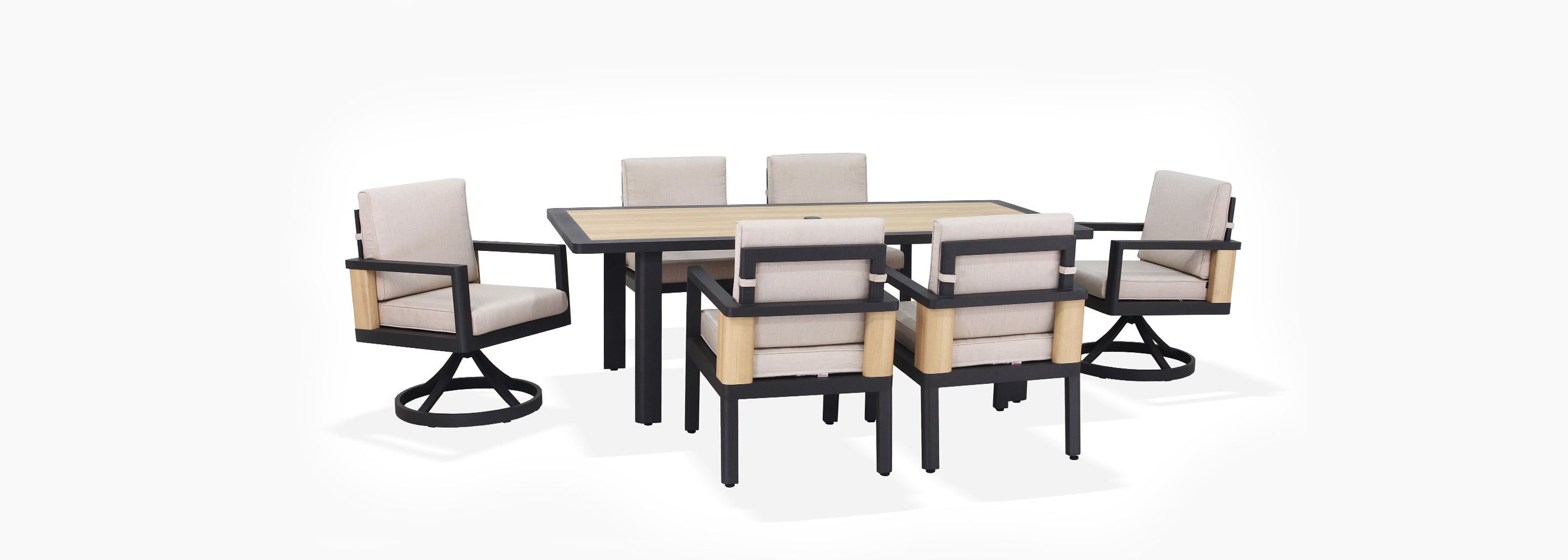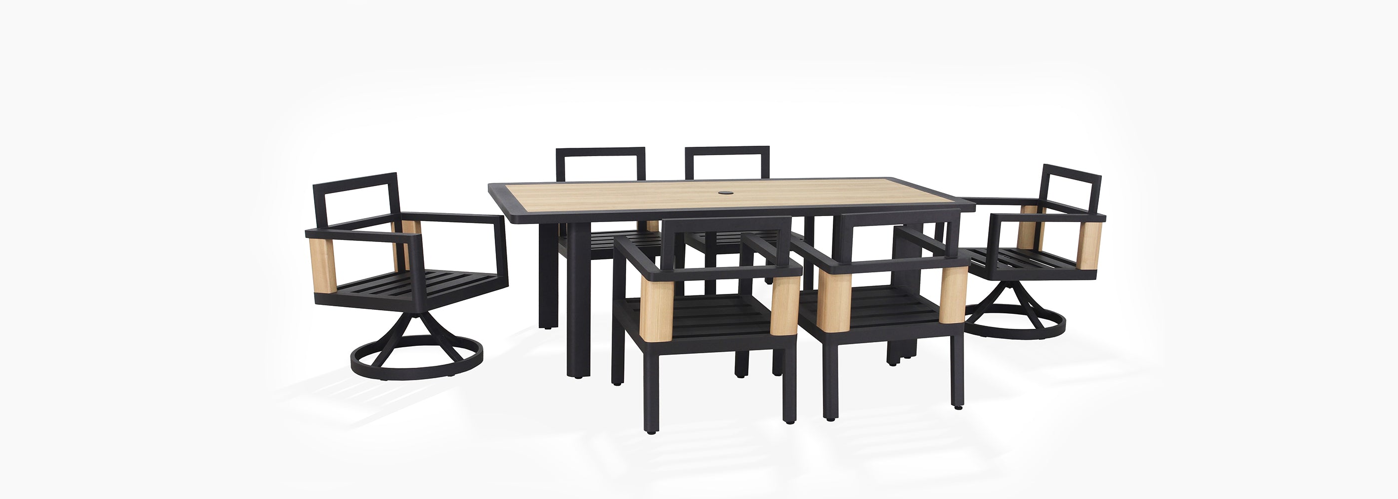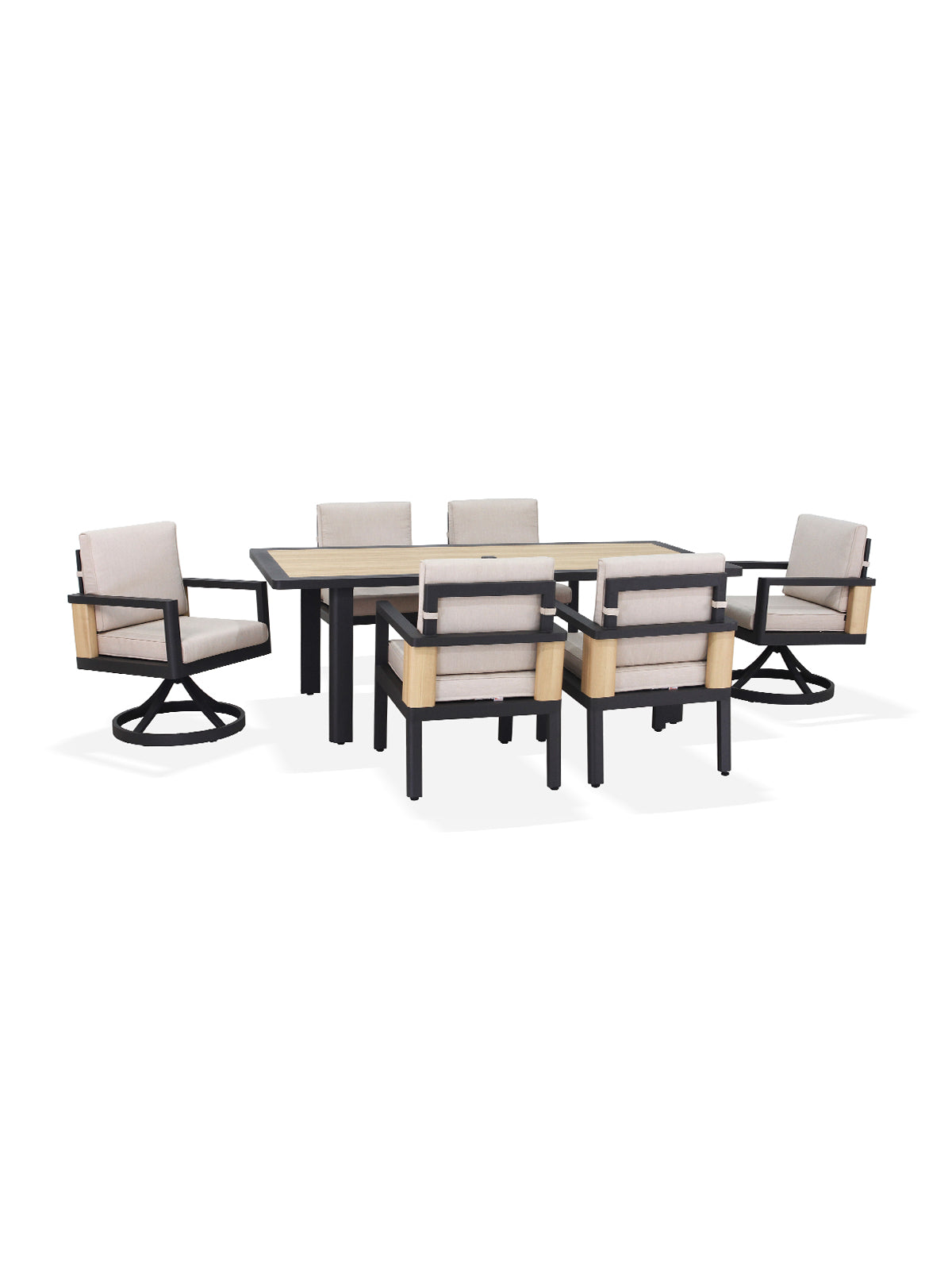 Host like you mean it. This commanding dining set seats six comfortably, with captain's chairs that swivel so nobody misses a moment. It’s perfect for everything from Saturday night cocktail confabs to long, leisurely Sunday brunches. Thoughtful touches, like an umbrella hole and a built-in bottle opener, prove you've thought of everything. Your outdoor space just became the main dining room.